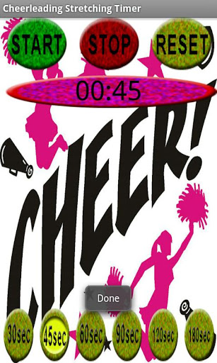 This app is meant to help Cheerleaders do there Stretches with out the need to keep look at the clock just pick the preset second intervals 30sec, 45sec, 60sec, 90sec, 120sec, 180sec and the alarm will sound when the time has passed.This make it easier for you to focus on the stretch so you can get the most out of it and the best part is that this app is FREE!!