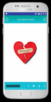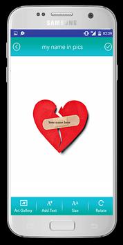 My name in pics add photo name to your creator: This app allow you add text on photo from gallery or take new photo to create love names. You can drag, move, zoom-in, zoom-out, rotate,... Your photo with be more lively with text and photo name.