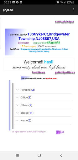 * Set your poplair spot with "setPoplairSpot" , when you login for the first time the present location will be auto saved as your first poplair spot.