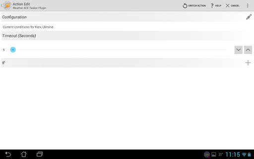 The Tasker plugin allows you to get current conditions, today's weather and weather information about several next days from "Weather ACE" application. It also allows to update weather data (limited number per day) and provide condition that fire after weather data update. The plugin use free Weather ACE API for to get all the information.