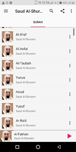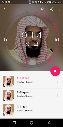 Provides Complete Audio Quran by Saud Al-Shuraim with advanced audio player feautures. such as: - Play All Surahs - Play Some specified Surahs - Search Surah - Home Screen Widgets - Background Player