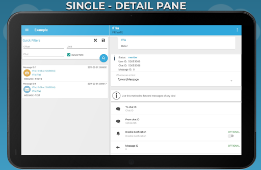 Write text, upload photo, documents, download video, audio, inspect each media files to find its fileID, play video and much more! Just insert your token (or tokens if you want to manage multiple bots through this app) and play with it!