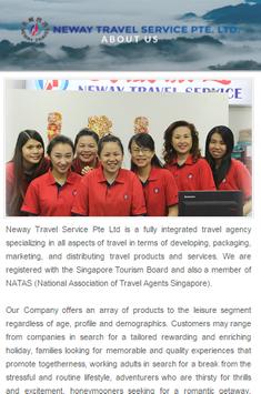 Neway Travel Service Pte Ltd is a fully integrated travel agency specializing in all aspects of travel in terms of developing, packaging, marketing, and distributing travel products and services.