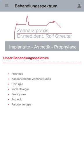 Mit der App der Zahnarztpraxis Dr. Rolf Streuter werden Sie bestens informiert und erhalten einen Überblick über Team und Leistungsspektrum.