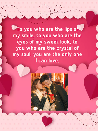 Let this app help you express your love! Choose your favorite romantic card template and write down heartfelt love quotes and romantic wishes. Press the send button and surprise your partner with lovely Valentines card messages.