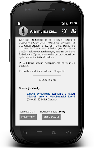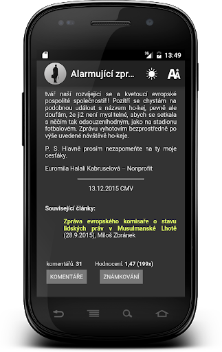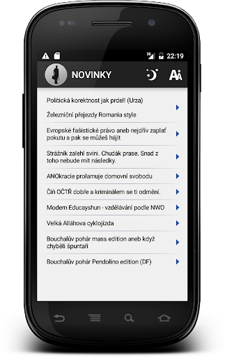Ứng dụng rút thông tin từ DFENS-CZ.COM. Hiển thị tin tức, cũng như các bài viết mà bạn có thể đánh giá và cuối cùng nhưng không kém phần quan trọng bên dưới chúng, tất cả ở dạng thiết bị di động tuân thủ hơn. Trang chủ Bạn có thể sử dụng chế độ ban đêm và khả năng thay đổi kích thước phông chữ từ bốn tùy chọn. Ứng dụng gia đình có khả năng tắt trình bảo vệ màn hình trong khi đọc bài viết :-)