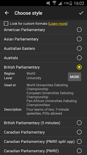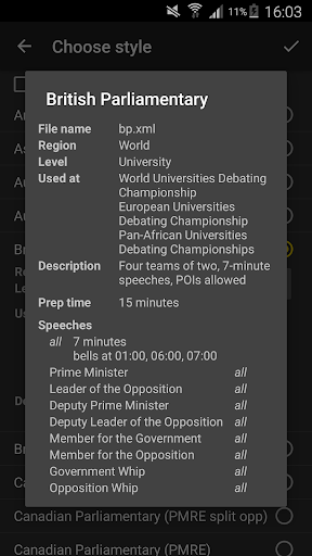 You can also write your own debate format (style) in XML for the app to use—see the app wiki at https://github.com/czlee/debatekeeper/wiki for details.