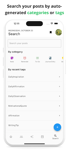 - Automatic categorization of posts: Just post whatever comes to mind and Reflectr will automatically categorize the post for you, whether it's a reminder, a note, idea, observation, to-do, goal, quote, challenge, insight, or plan, the AI will figure it out and mark your posts accordingly. So, there's no need to worry about creating folders, moving things around and stressing about organizing your notes, Reflectr will do it for you. You can also search by category to easily find all your reminders, ideas, etc.