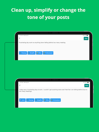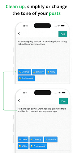 - AI-assisted writing styles: Simply type or voice record your notes/thoughts and use one of the AI-assisted writing styles to tidy up or simplify your posts. Don't fret about grammar, spelling mistakes, or perfect sentence structure – let AI handle it for you.