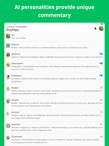 - AI personalities: You're not alone in your journaling process. Our AI personalities will comment on your posts and also provide daily and weekly affirmations, recommendations and motivations. All based on your posts. Choose from Philosopher, Optimist, Comedian, Realist, Skeptic, Contrarian, Analyst and Dreamer.
