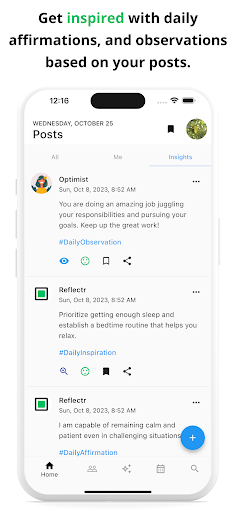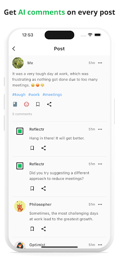 Additionally, Reflectr will automatically categorize your posts (i.e. note, journal, to-do, reminder, goal, etc), add tags, and automatically determine your mood for the day based on your journal entries. The AI comments, inspiration and feedback will help you gain clarity, and be more focused and productive.