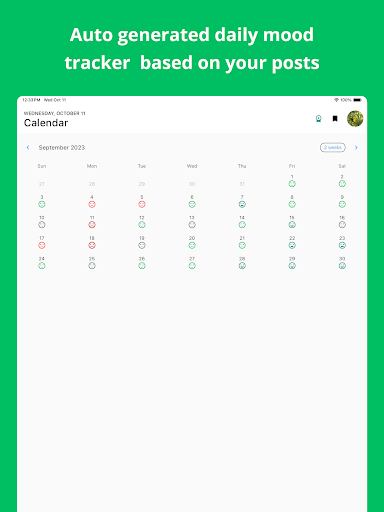 - AI-based mood calendar: Just post whatever comes to mind, and after each day a mood indicator will automatically be created for you based on the sentiment of your posts. You can then track your daily mood trends on the calendar, providing you with a comprehensive view of your mood patterns throughout the month.