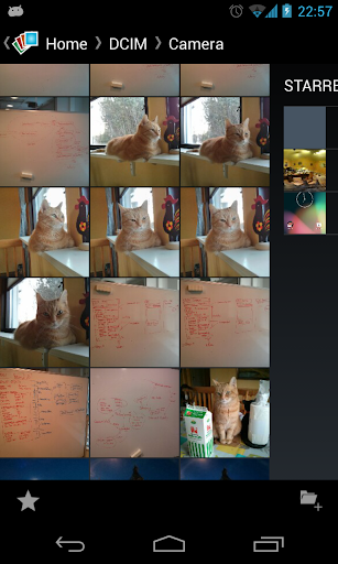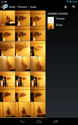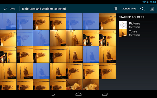 It's made to be as fast as possible in moving pictures between several folders. To the right you have your favorited folders. You add them by going into a folder and press the star button. When long pressing a picture you start the select mode. Then it's just pressing several pictures and click on a folder at the right to move or copy them there. There are also actions for sharing the selected images and removing them.