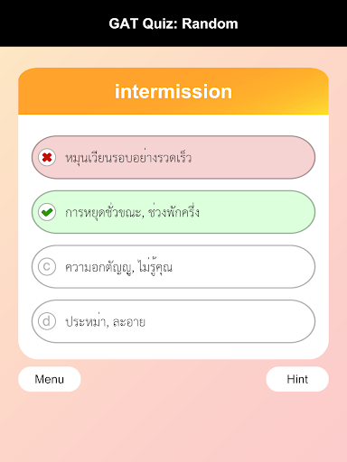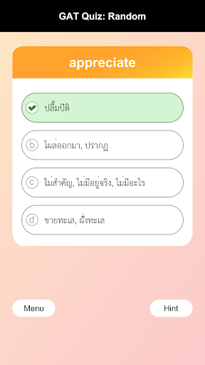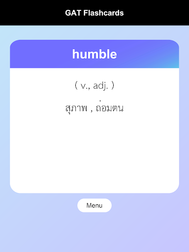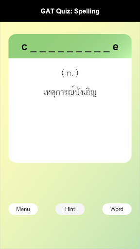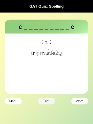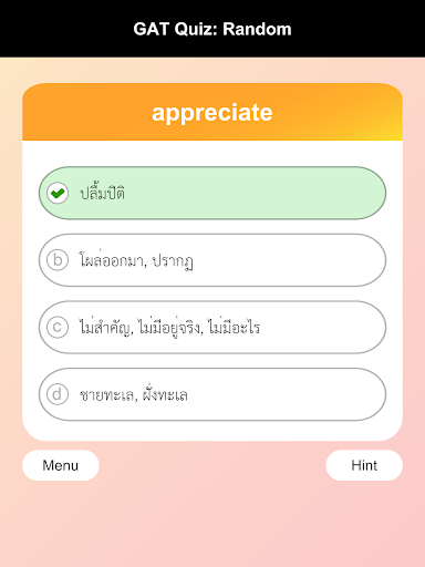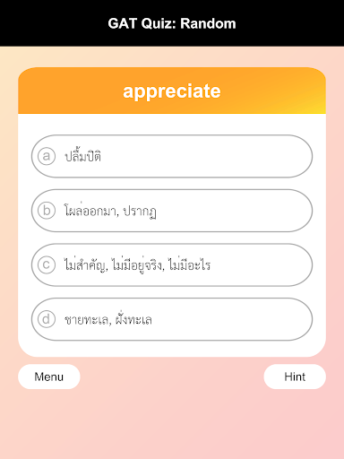 English-Thai Vocabulary Quiz for GAT : total 3,000 words from past GAT exam and M4-5-6 English syllabus. Help you to remember vocabulary for preparing your exam.