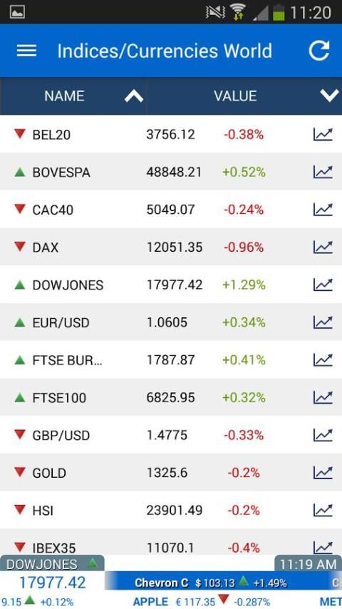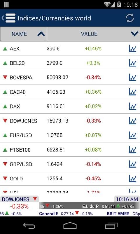 - The application allows you to track 30 indexes and currencies of the world (Gold , Oil , EUR / USD) and the details (graphic) of all actions in the world.