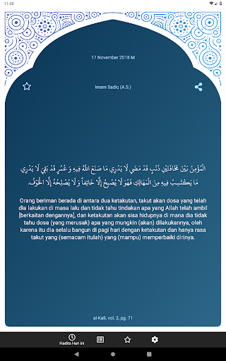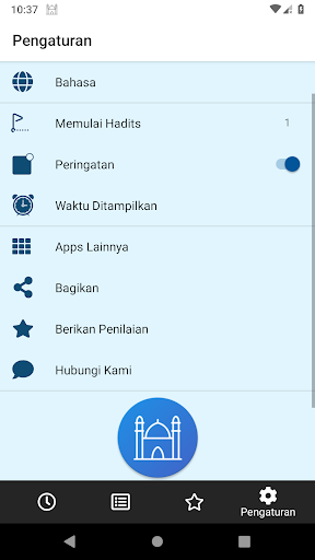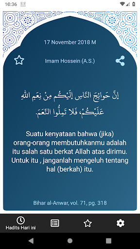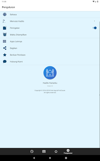 • Anda dapat mengatur waktu untuk memunculkan hadits harian di layar Anda setiap hari secara otomatis.