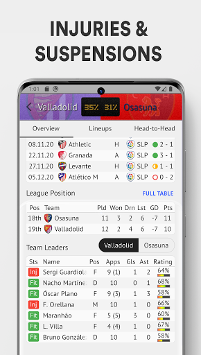 • Information on suspended and injured players;