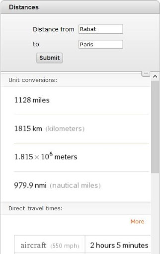 Vous aurez des information sur la distance en Kilomètres , miles , mètres. vous aurez également des informations sur le temps nécessaires pour parcourir votre trajet en avion et en voiture , ainsi que le temps du son et de la lumière.
