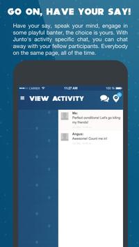 Each activity in Junto has an integrated chat function - kind of like a dynamic group chat, that changes automatically depending on the people joining the activity. All the people that join the activity will be included in the chat, and all the people that decline the invitation won’t be bothered with chats that don’t affect them. Use the activity chat to help you plan and communicate activity details with your invited friends.