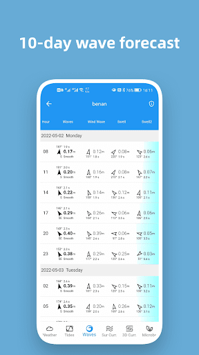 4.Ocean wave forceast: support access to wave height, wave cycle, wave direction and 3 categories of wave data.