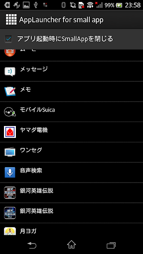 アプリを起動するとインストール済みアプリ一覧が表示されるので、SmallAppで表示させたいアプリをタップしてください。