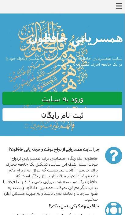 حافظون یک اپلیکیشن همسریابی است که به صورت اختصاصی در زمینه صیغه یابی و ازدواج موقت شرعی فعالیت میکند. حافظون همواره شما را تشویق به ازدواج دائم میکند؛ اما چنانچه شرایط آن برای شما فراهم نیست، به عنوان یک شبکه اجتماعی، به شما کمک می کند تا فرد مورد نظر خود را جهت صیغه شرعی و ازدواج موقت، پیدا کنید. ابتدا به صورت رایگان ثبت نام نمایید تا بتوانید متقاضیان صیغه (جنس مخالف) را مشاهده و با آن ها ارتباط برقرار نمایید.