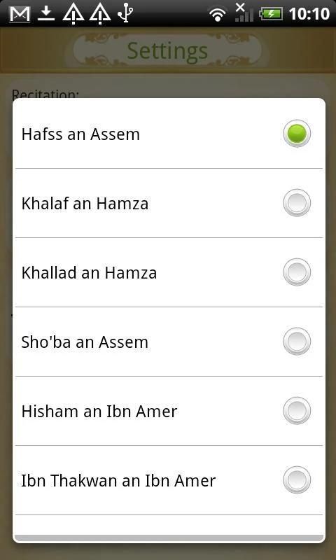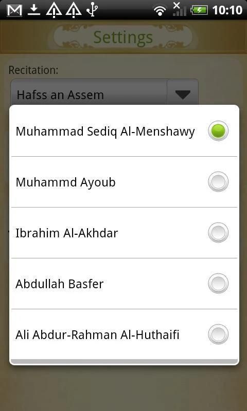 - استماع التلاوة لمحمد صديق المنشاوي وعلى عبد الرحمن الحذيفي ومحمد أيوب وإبراهيم الأخضر وعبد الله بصفر وعبد الرشيد صوفي ومفتاح السلطني ومحمود خليل الحصري وعبد الباسط عبد الصمد ومحمد الطبلاوي