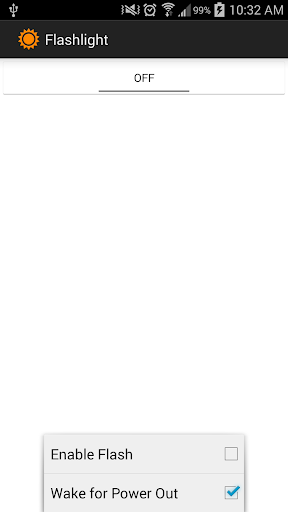 The power outage detection will detect when the lights have gone out in the room, by using the light sensor of the device. When flashlight is running, turn the option on by hitting settings, and then the checkbox next to "Wake for power out". Then, touch the phone's standby button, to make it go to sleep. Keep in mind, the light sensor uses power, and the CPU cannot go to sleep, so watch your battery.