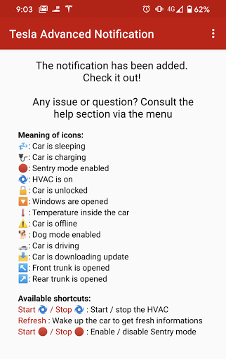 This application offer a useful notification with car state, last battery status and charge state, without waking up the car!
