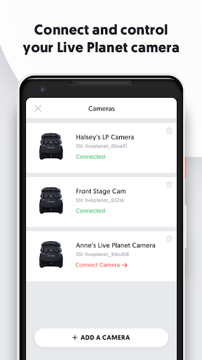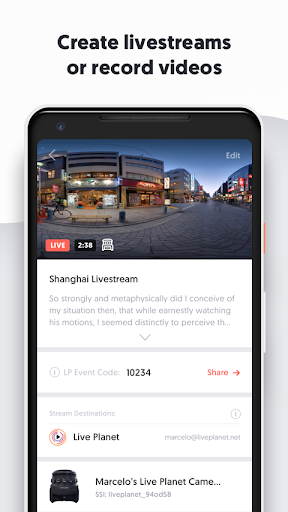 The Live Planet™ VR Creator App enables you to record or livestream perfectly-stitched, beautiful stereoscopic VR video from your Live Planet camera to VR headsets and social channels within minutes! This powerful on-the-go app makes it easy to control your Live Planet VR Camera, including: