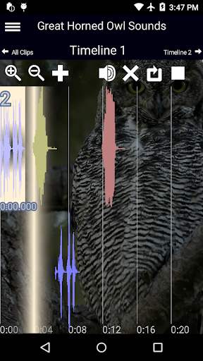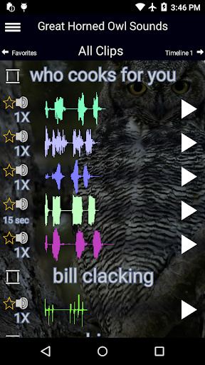 • 16 different owl sounds • each clip is uniquely numbered, colored and drawn with its own waveform • play multiple sound clips at once • mark "favorite" clips for easier playing • organize clips on timelines