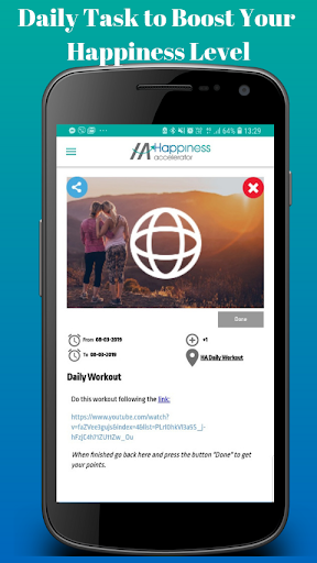 You will receive on a daily basis a task for boosting your happiness, a workout to complete, a meditation practice to listen to, as well as an inspirational thought and a funny fact. By completing them you will strengthen and build upon your inner values as: your compassion, friendship, love, accomplishment, creativity, awareness, happiness, and sense of humor.