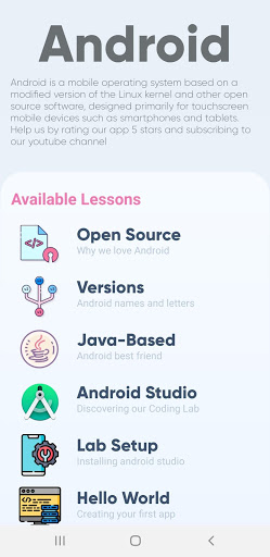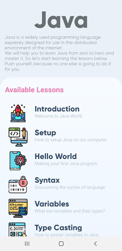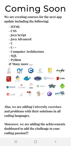 Currently, we are providing Java, Android, Kotlin & Flutter courses to explain programming concepts. You can learn these concepts and apply in them in every programming language. If you want to learn C programming, or learn C , or learn python, or learn java, this app will help. Soon, we will support other Programming Languages.