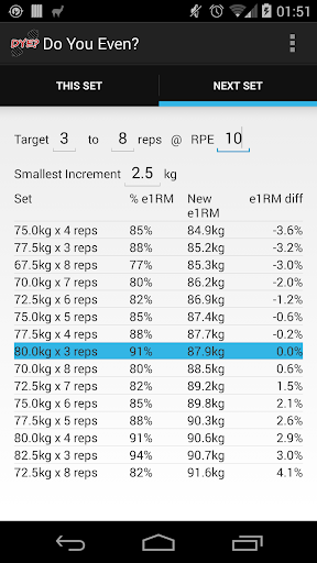 is a one-rep max calculator that also suggests sets to do based on your estimated 1RM. Check out the sweet charts!