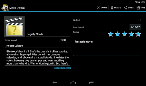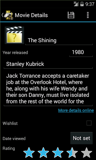 Movie Log lets you keep track of movies you have seen or want to see. You can share your best movies with your friends as well as rate them or add notes.