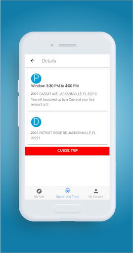The Upcoming Trips section displays trips for the day of service, as well as trips three days in the future. To view additional details about the trip, simply select the pickup window. From the trip details, you will also have the option to cancel the trip.