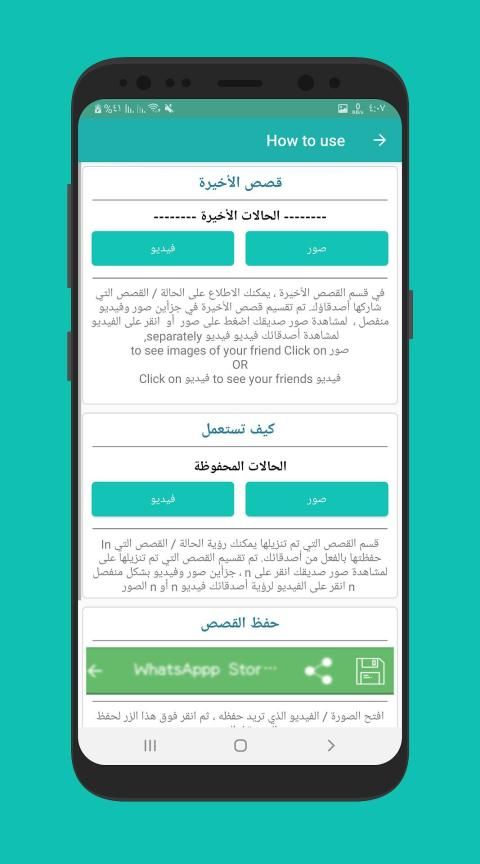 ☆ الحالات التي قمت بتحميلها يتم حفظها في معرض الصور في جهازك وفي قسم الحالات المحفوظة في التطبيق