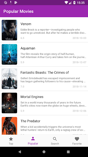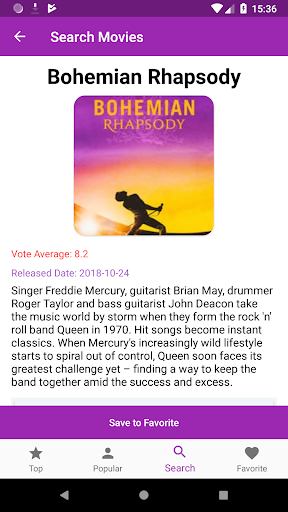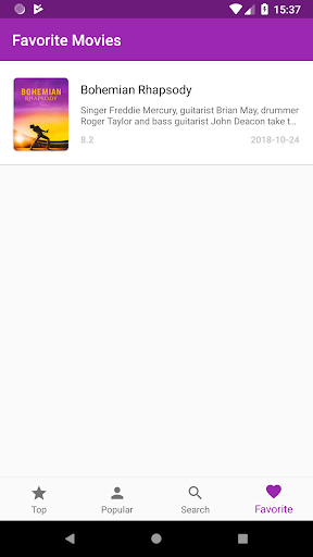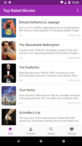 This app shows top rated and popular movies. It also support the search function so that you can search any movies and save on your favorite list.