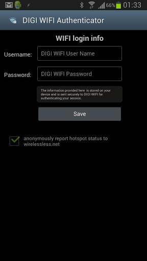 Aplicatia permite autentificarea automata pe hotspot-urile DIGI WIFI.