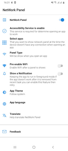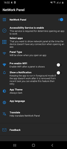 The app uses Accessibility service to determine when an app in the "Select apps" list is opened. WiFi auto connect ( NetWork Panel ) does not collect any other information from the service.