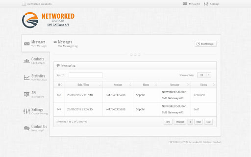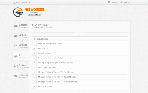 Sending and receiving text messages programmatically has never been simpler.Networked Solutions is proud to present SMS Gateway API.1. download SMS Gateway API2. Register3. Send a post request to our server and we will forward it to your phone for you.Log on to SMS Gateway APIs web interface at http:smsgateway.me for full documentation or to check the log of all your incoming and outgoing messages.
