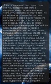 Welcome! It is a unique service for making money on the Internet! The essence of earnings is that you install and run applications from Google play on your device. For each installation of the application you are credited to your account 5 rubles! You can transfer this money to your mobile phone account!