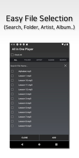 You can easily find audio files by all, folder, artist, and album. If necessary, you can find files from External storage like SD card by manual search