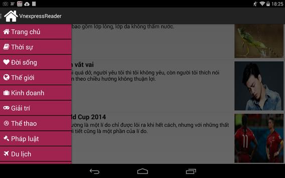 Một ứng dụng đọc tin tức từ Vnexpress, một trang báo điện tử nổi tiếng tại Việt Nam. Tại đây, những thong tin mới nhất, cập nhập nhất sẽ liên tục được tải về cho bạn đọc có thể theo dõi sát sao tin tức trên tất cả các lĩnh vực như Thời sự, Thể thao, Pháp luật, Giải trí....