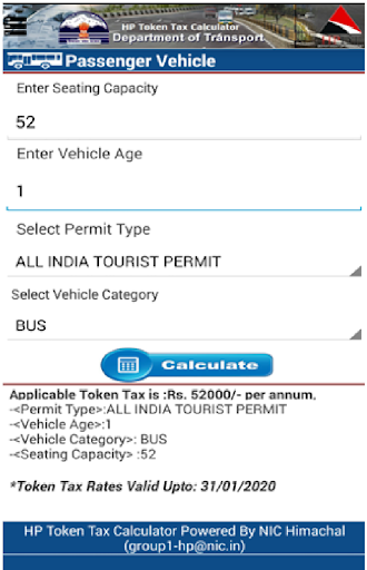 Passenger Vehicle: For Passengers Vehicles like Buses, Maxi Cab and Taxi etc., Token tax is calculated on the rates notified by the HP Transport department and user entered parameters like Seating capacity, Age, Permit Type and Category of Vehicle. Token tax for Passenger Carriage is paid at the time of registration of vehicle