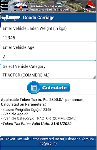 Goods Carriage: For Goods Vehicles like Tractor, Tanker and Heavy Goods vehicles etc., Token tax is calculated on the rates notified by the HP Transport department and user entered parameters like Laden Weight, Age and Category of Vehicles. Token tax for Goods Carriage is paid at the time of registration for opted tenure (Quarter/ Half Year or Complete Year) and thereafter quarterly, half yearly and annually to the respective RLA/RTOs of Himachal Pradesh.