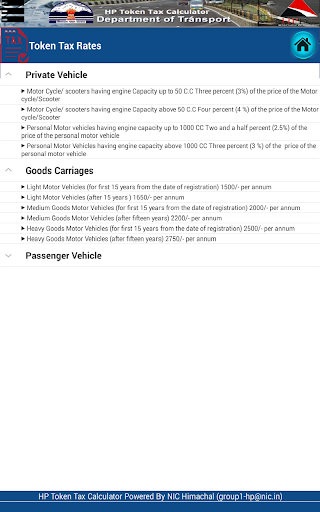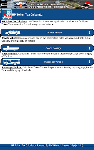 The app is to facilitate Private/Good Carrier and Passenger Vehicle owners to calculate the applicable Token Tax based on the parameter values applicable for particular vehicle.