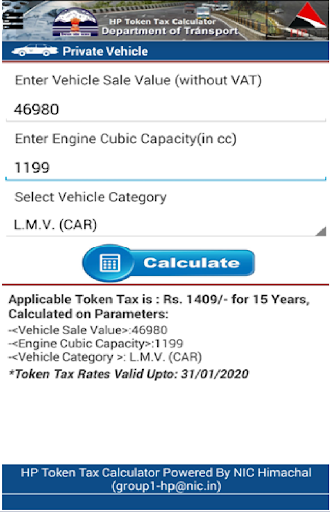 Private Vehicle: For Private Vehicle like car, jeep and two vehicles etc., Token Tax is calculated on the rates notified by the HP Transport department and user entered parameters Sales Value (Without Vat), Cubic Capacity of Vehicle engine (in cc).