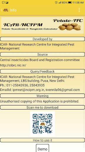 Registered pesticides for use on a particular crop against recommended insect pests and diseases at recommended dosages using appropriate application methods with precise dilutions are important efficacious management of target pests without leading to secondary pest outbreaks or pest resurgence or hazards to human health and environment. Increasing concerns of safety and toxicity of pesticides require increasing awareness and strict adherence to judicious use of pesticides in terms of their selection, procurement of appropriate quantity, choice of application method, dilutions in spray fluid and waiting period after application before harvest of produce. ICAR-NCIPM felt the need for provision of easy access to registered pesticides to all stakeholders of crop protection with information on recommended dosages and application methods so as enhance their proper field use on scientific basis.