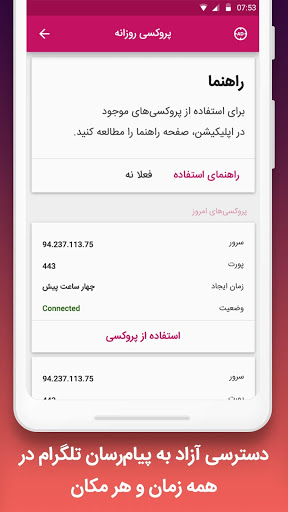 ما در برنامه فیلترشکن لیست گسترده ای از پروکسی های تلگرام را برای شما آماده کرده ایم میتوانید به راحتی و با چند کلیک به لیستی از پروکسی های پر سرعت روز دنیا دست یابیید.